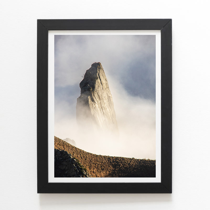 Poster encadré (bois noir) ou poster seul de la dent de la Rancune, dans le Massif du Sancy, dépassant d’une mer de nuages en Auvergne et dans la vallée de Chaudefour.